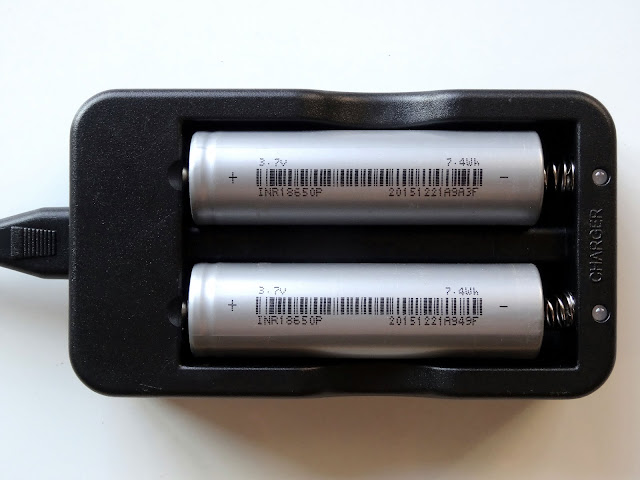 Connect the charger to power. The LEDs will light in red indicating charging the batteries: